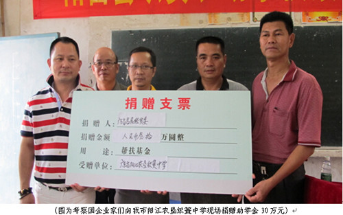 7月8日,在省侨联和省侨商会的支持下,阳江市外侨局(侨联)精心策划,多方面协调,组织了广东省客属海外联谊会、天豪经贸控股集团有限公司、澳门中智永信进出口贸易有限公司、广州市天珑包装有限公司、广东合胜化工有限公司等10多家著名侨资企业,对阳江市进行经贸考察和扶贫助学。