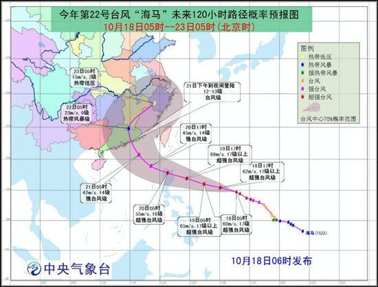 “海马”将于19日夜间到20日早晨登陆或擦过吕宋岛东北部一带沿海,20日中午前后移入南海东北部海域,之后逐渐向广东东部到福建南部一带沿海靠近,并有可能于21日下午到夜间在上述沿海登陆(台风级,33~40米/秒,12~13级)。