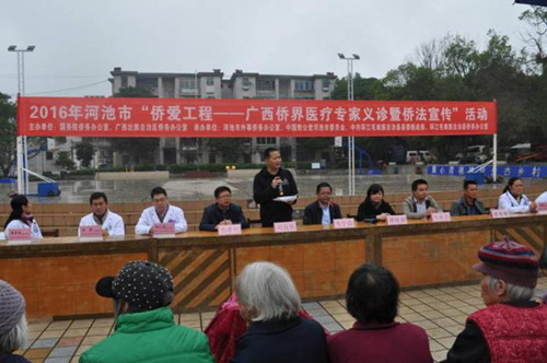 据了解,此次由国务院侨办、广西壮族自治区侨办主办的2016年度“侨爱工程-广西侨界医疗专家义诊暨侨法宣传活动”是首次在河池举办。河池市外侨办副主任韦宁昌、致公党河池市委副主委刘良钦、环江县委常委、统战部部长谭姝丽出席了活动启动仪式。