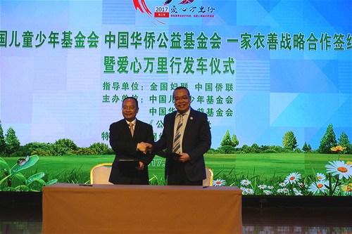 人民网北京4月15日电 中国儿童少年基金会、中国华侨公益基金会14日在京举行“一家衣善”公益项目战略合作签约暨“爱心万里行”发车仪式。仪式上,全国妇联副主席、书记处书记邓丽,中国侨联副主席、中国华侨公益基金会理事长乔卫及《公益时报》总编赵冠军向“爱心万里行”车队转交了两家基金会共同捐赠的700万元款物和50万件衣物。中国儿童少年基金会秘书长朱锡生、中国华侨公益基金会秘书长何继宁签署了战略合作协议。
