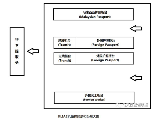 二、请根据来马行程选择合适的入境柜台。如经吉隆 坡国际机场过境前往第三国,停留不超过120小时,可经“Transit”柜台办理过境签入境;