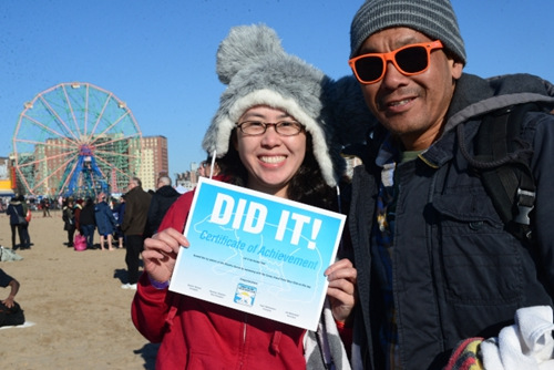 1日下午1时,在鼓乐队的演奏下,上千泳客分批在康尼岛下水,最年幼的参与者才七岁。冰冷的海水刺激得泳客大呼小叫,好不痛快。住在纽约的华人赖Ivory和李David第一次参加康尼岛元旦冬泳,上岸后还获得官方送出的证书纪念。两人感慨虽然天气不错,但毕竟是冬天、下水仍会冷,“我们进进出出好几次,很好玩、很过瘾,明年会再来!”