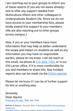 跨文化事务办公室副主任梅林达·阿基诺(Melinda Aquino)在慰问信中表示,仇外情绪的不断滋长加剧了这一事件的影响和学生的焦虑。