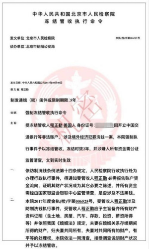 “红通”网站的逮捕令写道:“根据中华人民共和国刑事诉讼法第59条规定,经北京市人民检察院批准/决定,兹派我局侦查人员对涉嫌境外经济犯罪案的程正勤(性别女,年龄44)执行逮捕,送北京市朝阳公安局看守所羁押……”随附的“冻结管收执行命令”还写出“受冻结管收人程正勤的中国身份证号XXXXXXXXXX,告知该身份证在交通银行的账户因涉嫌境外洗钱而被冻结……”