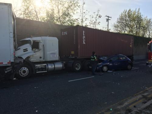据初步调查,因为判断失误,一辆卡车与另外一辆大货车追撞。当时,另外一辆载有三人的蓝色轿车从侧面经过,右侧追撞。因车速较快导致车身几近全毁。据现场警员说,遭追撞的第一辆卡车司机无碍,第二辆卡车司机受伤送医,轿车内至少三名亚裔送医,其中一人伤势较重。