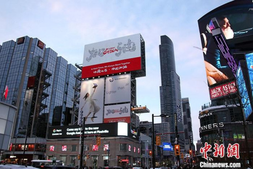 视频:多伦多市中心大屏幕播出公益广告为中国抗疫加油 来源:中国新闻网