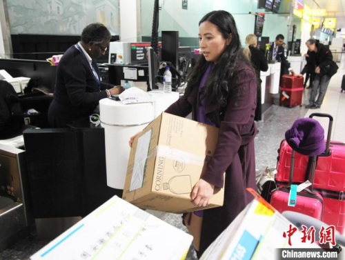 2月14日晚,旅居英国华人护士何彩霞辞去工作岗位,搭乘航班回国,奔赴中国抗击新冠肺炎疫情一线,为首位回国参与抗疫医护工作的旅英华人。图为何彩霞在伦敦希斯罗机场柜台前办理医疗防护用品托运手续。 张平 摄