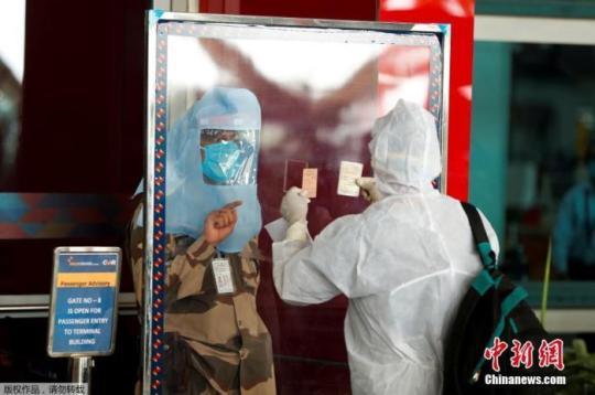5月25日,在印度孟买希拉吉国际机场,安保人员核对旅客身份信息。 印度政府允许国内航线自5月25日起恢复。
