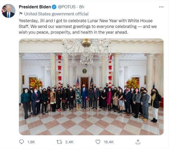拜登在社交媒体上表示,他与夫人及白宫工作人员一起庆祝农历新年,“我们向所有过节的人致以最热烈的问候,并祝愿你们在新的一年里平安、繁荣和健康。”他还发布了一张与白宫工作人员的合影。