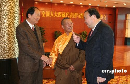 正在美国访问的中国全国人大西藏代表团长、全国人大代表、西藏自治区人大常委会副主任新杂·单增曲扎活佛18在与纽约侨学界举行的座谈会上,接受当地媒体采访。 中新社发 魏晞 摄