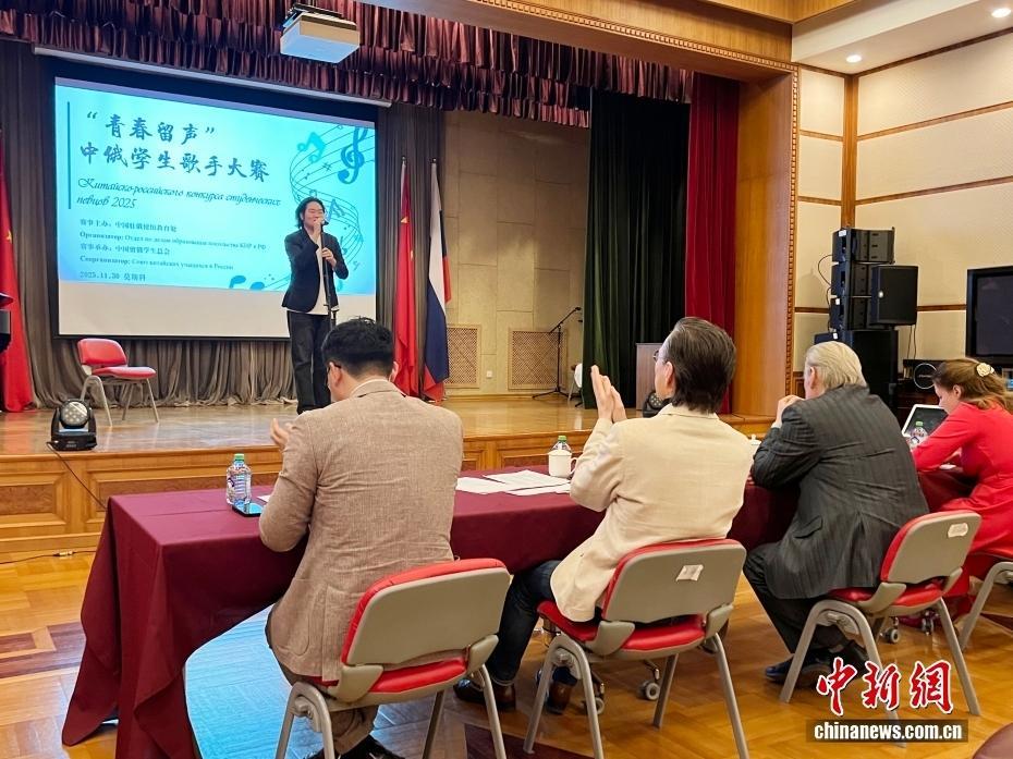 当地时间11月30日,“青春留声”中俄学生歌手大赛决赛在中国驻俄罗斯大使馆举行。本次赛事由中国驻俄大使馆教育处主办,中国留俄大学生和俄罗斯大学生参赛。图为中国留学生参赛选手演唱俄文歌曲。中新社记者 田冰 摄