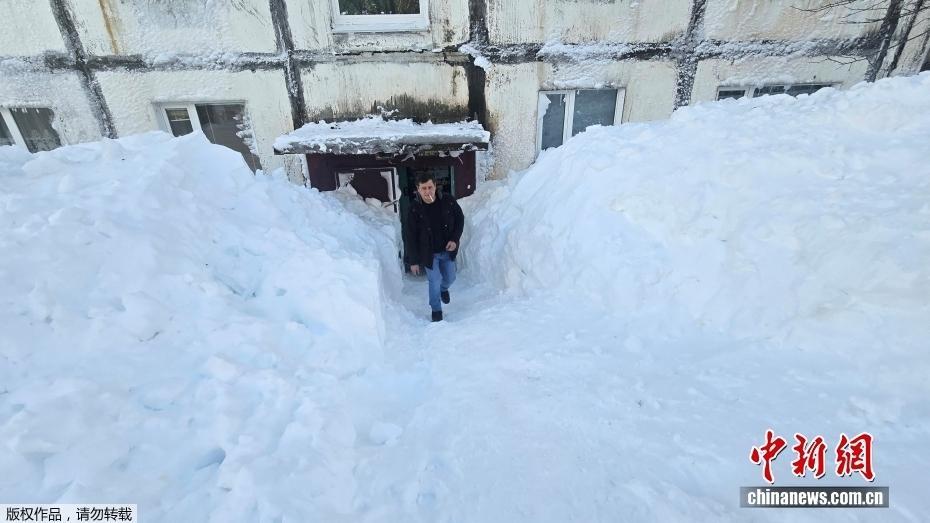 当地时间1月17日,俄罗斯堪察加边疆区首府堪察加彼得罗巴甫洛夫斯克市,一名男子走出被积雪包围的公寓楼。据报道,俄罗斯远东地区堪察加半岛遭遇数十年来罕见极端暴雪,部分地区积雪深度超过两米。