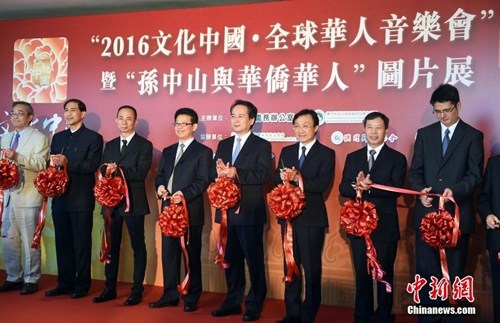 9月24日,澳门举行“2016文化中国·全球华人音乐会”暨“孙中山与华侨华人”图片展,国务院侨务办公室副主任谭天星(右四)、澳门特区政府社会文化司司长谭俊荣(右三)等出席。中新社记者 张宇 摄