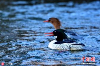 近日,吉林省抚松县流域出现了12只中华秋沙鸭,它们在水中觅食,摄影师在几百米之外的对岸拍摄到了一组珍贵的照片。最近几年抚松县境内栖息过不少珍稀鸟类,其中属中华秋沙鸭最名贵,属世界濒危物种。中华秋沙鸭开春从南方飞到这里,夏季在这里繁殖后代,属于中国一级重点保护鸟类。 一对中华秋沙鸭结伴出行,呆萌可爱。 图片来源:东方IC 版权作品 请勿转载