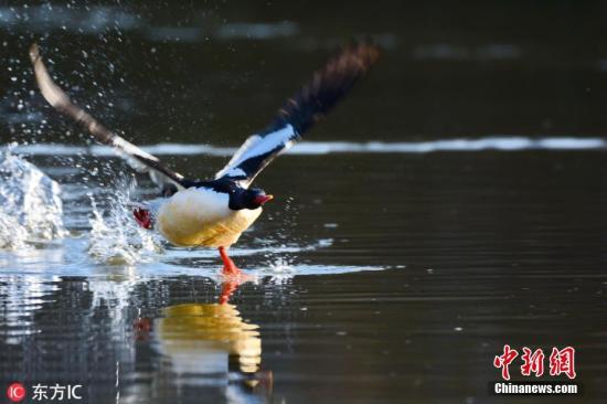 深秋的吉林山区能够拍摄到秋沙鸭觅食的照片非常难得,它们即将南下越冬,这将是珍贵的影像资料。中华秋沙鸭嘴形侧扁,嘴和腿脚红色,头顶的长羽后伸成双冠状,长相非常特别。 图片来源:东方IC 版权作品 请勿转载