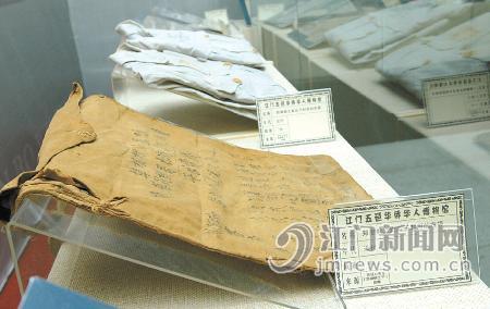 在所有的文物中,足以让人心灵震撼的是一件镇馆文物——“卖子救国”。工作人员小心翼翼地从展柜里打开透明袋,我们一看,这镇馆文物竟然是一个棕色的旧布袋和一件中山装。看着我们疑惑的眼神,正在展厅里整理资料的中国华侨历史学会理事、五邑大学副教授梅伟强告诉我们,这并非两件普通的物品,而是国家博物馆需要收藏的国家级文物,它的宝贵之处正在于它背后隐藏着的旷世义举。