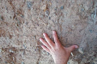 这段长10米左右的土墙北半段保存相对较好,还有近2米高,而南半部随着山势向上攀升,损毁得几乎只剩下了墙根。土墙周围长满了荒草和低矮的灌木,记者随于秉银爬上山坡走到土墙的墙根。土墙上有规律地布满了沿山势向北倾斜的线条,仔细一看实际上墙上不同土层分割交接的界限。“这是不同的土层,燕长城用土夯筑的较多,施工时墙的两边用木板夹住,中间填满土,然后夯实。每个土层的厚度都不相同,薄的8厘米,厚的15到20厘米左右。”