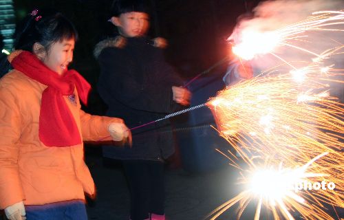 1月28日晚,几位小朋友在北京朝阳区和平街一小区燃放烟花。今年春节是北京市烟花爆竹“禁改限”后的第一个春节,鞭炮声在北京五环内城区时隔十数年后再次响起。(中新社/陈晓根 摄)