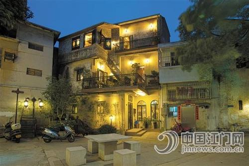 客厅、露台、图书角、吧台、船床、洗手间……这所由旧民居改造而成的三层小楼,有着现代化的气息,却又显得十分纯朴。在这里,你不仅可以看见老江门人所熟悉的桌椅板凳、以葵扇为主要元素的吊扇、各种充满五邑风情的老照片,更有别具风格的挂画、倚墙而立的木雕屏风、悠扬转动的黑胶唱片机、五颜六色的满洲窗等。
