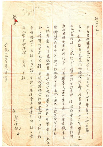 耀东在新马没头苍蝇般东冲西突,寻找谋生糊口之计,唐山父母却对他抱着莫大期望。“卅七年古七月十一日” “父仰唐” 寄来回批(仅余内函)殷殷嘱托: