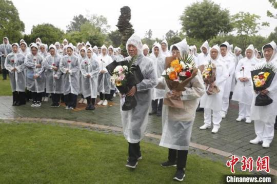 在漫天大雨中,家人、同事来到墓园缅怀吴孟超夫妇,一朵朵鲜花寄托着他们的思念。 曹希 摄