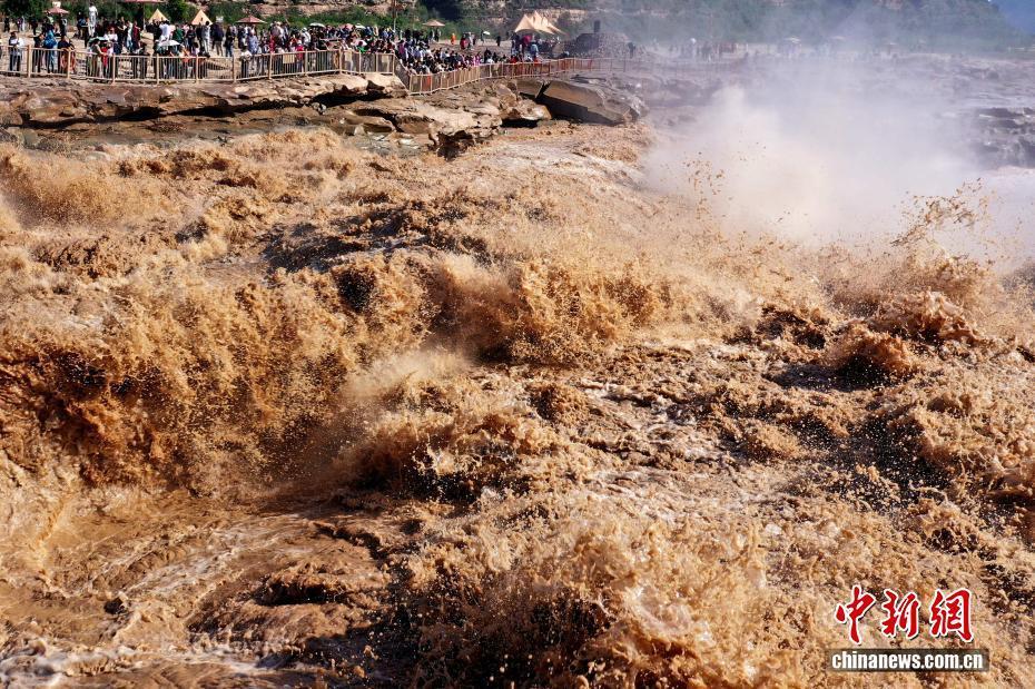 9月23日,游客在山西吉县黄河壶口瀑布景区游览观瀑。金秋时节,受上游降雨和水库调节放水影响,位于山西吉县和陕西宜川县交界的黄河壶口瀑布水量大增,壮美奔腾景象吸引众多游客前来游览。(无人机照片)