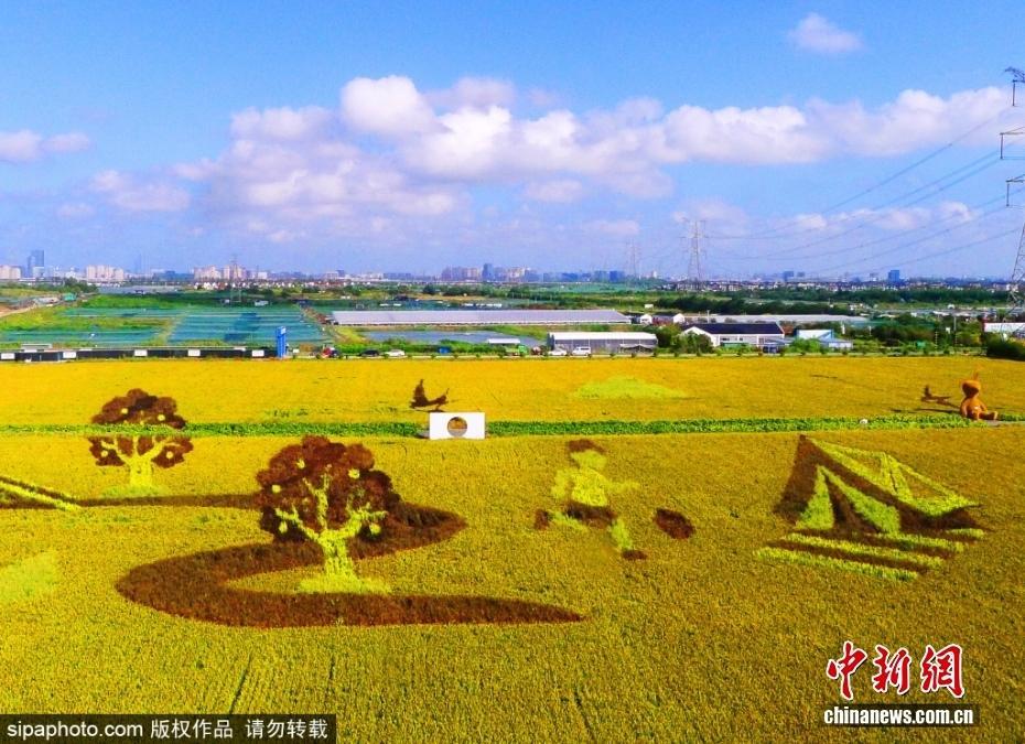 10月10日,金秋十月,江苏省苏州市吴江区同里镇北联村成片的秋稻渐趋成熟,俯瞰、近观蓝天白云掩映下的一幅幅“稻田画”色彩缤纷,构成了美不胜收的秋日“丰”景。