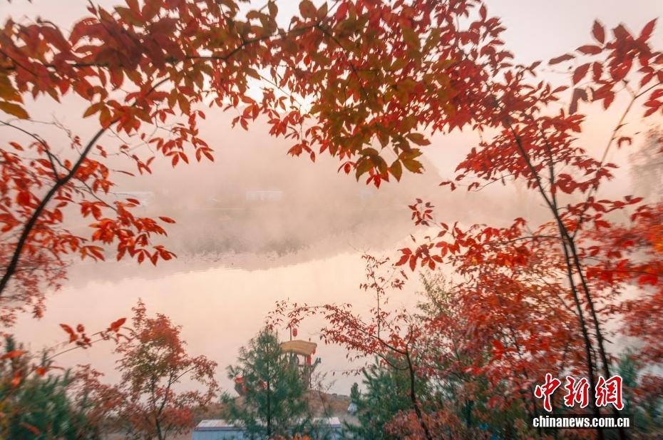 10月12日,吉林省舒兰市“枫水人家”休闲家庭农场秋景,红枫似火,湖面薄雾笼罩。