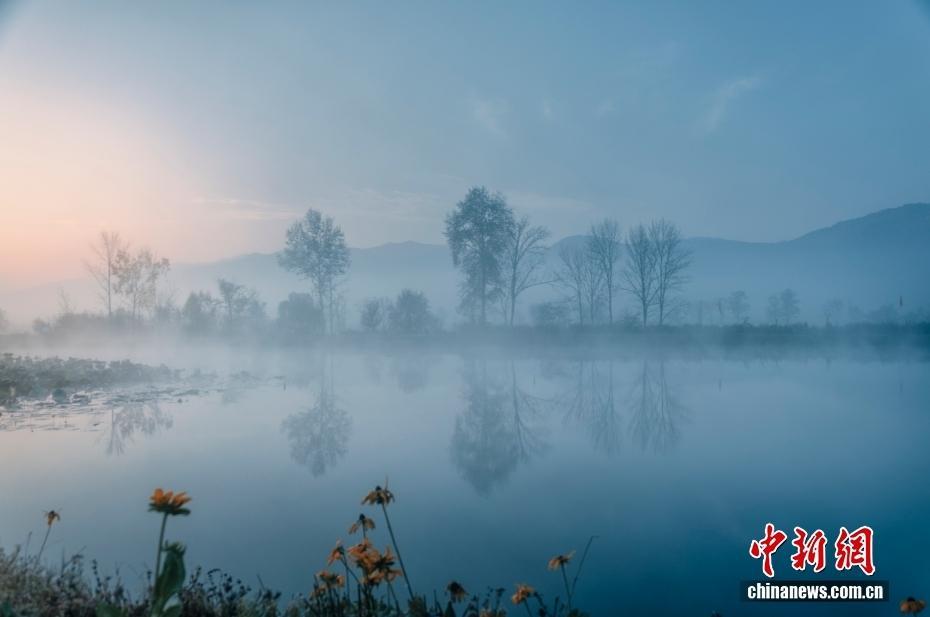 10月12日,吉林省舒兰市“枫水人家”休闲家庭农场秋景,湖面薄雾笼罩。