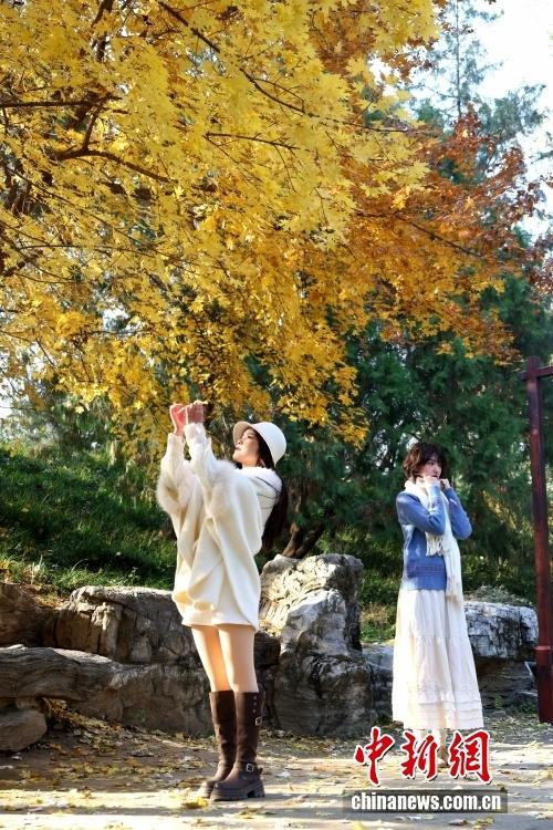 11月3日,游客在北京圆明园遗址公园踏秋赏景。眼下,圆明园秋色正浓,吸引众多游人前来打卡拍摄。