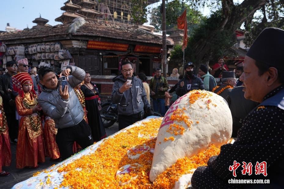 12月4日,尼泊尔民众在加德满都以游行、集会等方式庆祝传统节日尤麻瑞·普什节。尤麻瑞·普什节是加德满都原住民尼瓦尔人重要节日,标志尼泊尔稻米收割季结束。民众在节日期间会食用尤麻瑞等传统食物,并向谷物女神祈福,感恩丰收并祈愿来年好运。图为尤麻瑞模型吸引民众拍照。中新社记者 崔楠 摄