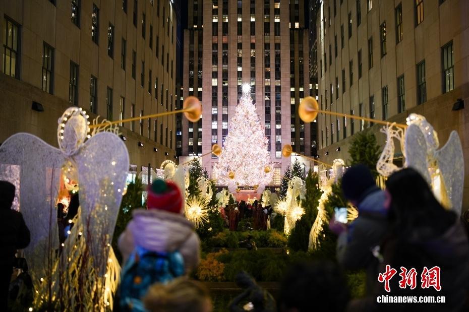 当地时间12月4日晚,矗立在美国纽约洛克菲勒中心的圣诞树灯光绚丽,人们纷纷前来观赏这棵纽约市最大的圣诞树,它于一天前被点亮。这棵挪威云杉来自纽约州,树高约23米,树龄约75岁,树上挂着超过5万颗LED灯,顶部放置的是重约408千克的施华洛世奇水晶星。中新社记者 廖攀 摄