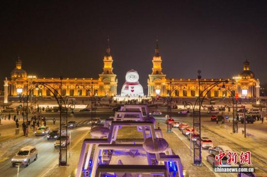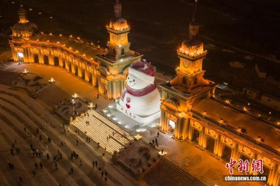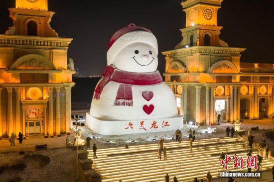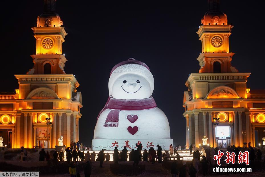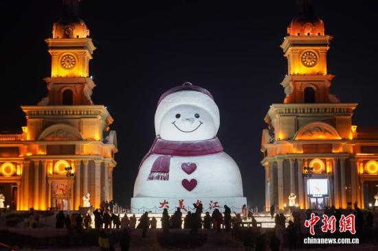 12月23日,随着夜幕降临,哈尔滨市道里区音乐公园的“网红大雪人”在灯光的映衬下更显可爱,其经典的红帽、红围巾与爱心纽扣造型温暖依旧,成为游客热门打卡点。图为游客在大雪人处打卡。中新社记者 赵宇航 摄