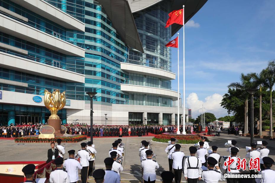 1997年7月1日零时,湾仔会展中心新翼五楼大会堂。雄壮激昂的国歌声中,鲜艳的五星红旗与紫荆花区旗,相伴冉冉升起。这是一个庄严的宣示:中华人民共和国恢复对香港行使主权,香港特别行政区正式成立。