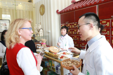 中东欧中医药学会会长、匈牙利岐黄中医药中心主席陈震博士为来宾们用英文深入浅出地做了有关中医药的专题讲座。中医医师向来宾展示了中药柜台,介绍了中药药材的功效,指导来宾学习了常用保健穴位的选取及按摩方法,并就外宾提出的相关问题给予细致解答。陈震博士还为部分来宾进行了现场诊疗,受到好评。
