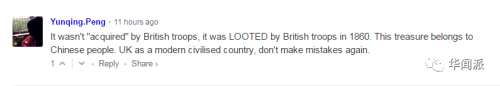 在网页的下方就有中国网友评论到:“这根本不是英国军队‘获得’(acquired),根本就是英国军队在1860年抢来(looted)的。这些宝贝是属于中国人民的,英国作为一个现代文明国家,不应该让历史重演。”