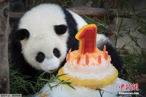 资料图:当地时间1月14日,马来西亚吉隆坡,旅居马来西亚大熊猫“兴兴”和“靓靓”的第二个宝宝迎来1岁生日,马来西亚国家动物园的工作人员为其准备了生日蛋糕庆生。