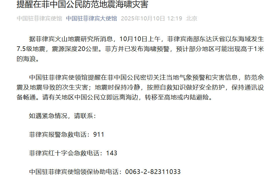中国驻菲律宾使领馆提醒在菲中国公民密切关注当地气象预警和灾害信息,防范余震及地震导致的次生灾害;地震时保持冷静,按照自救知识做好安全防护,保持通讯设备畅通。请有关地区中国公民立即远离海边,转移至高地或内陆避险。