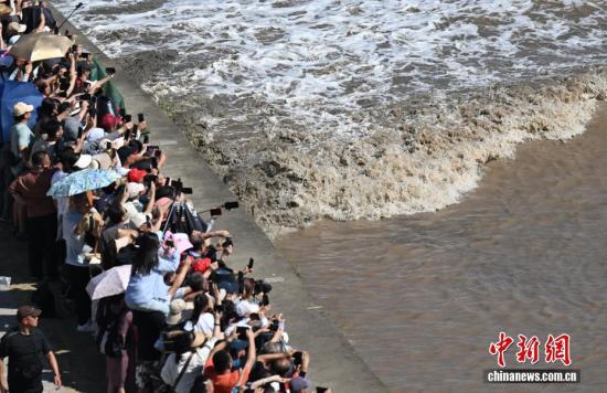10月9日,钱塘江大潮潮头吸引众多游客。当日是农历八月十八,钱塘江迎来大潮汛,在浙江嘉兴海宁盐官,众多游客争睹“八月十八潮”,感受钱塘江大潮的汹涌壮观。 中新社记者 王刚 摄