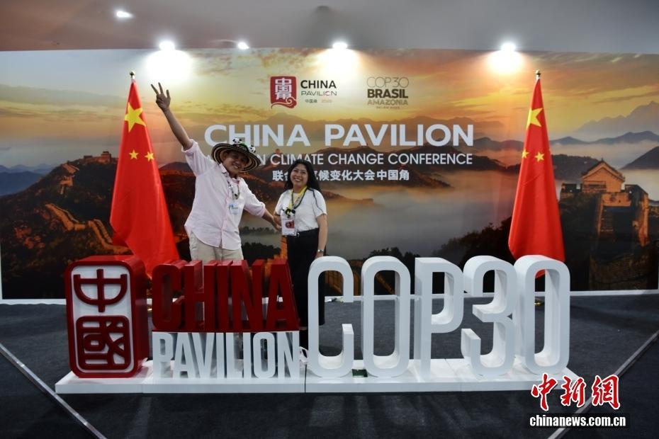 当地时间11月10日下午,《联合国气候变化框架公约》第30次缔约方大会(COP30)在巴西贝伦举行,会场布置处处可见热带绿植,以竹木等天然材料为主,宣扬环保理念,各国场馆创意呈现当地自然风光,满吹自然风。图为《联合国气候变化框架公约》第30次缔约方大会(COP30)中国角展现中国长城美景,布置吸引外国参会青年留影。中新社记者 林春茵 摄