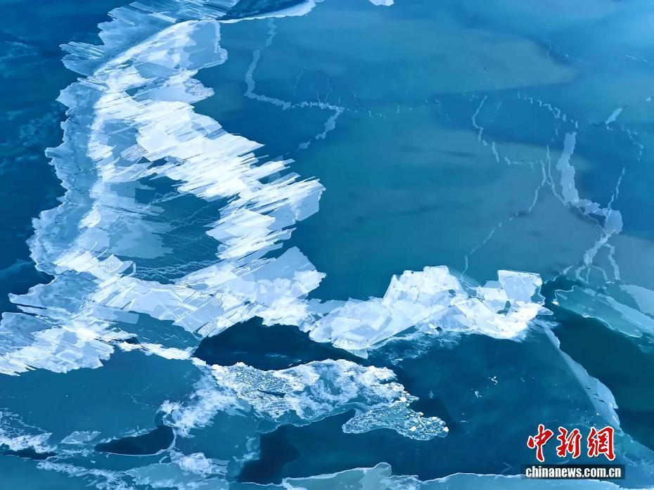 大雪时节,摄影师在青海省海北藏族自治州刚察县境内航拍到青海湖幽蓝的湖面上已出现结冰,冰凌随风摇曳,如同破碎的“玉带”。目前,青海湖北部湖岸区、鸟岛、沙岛等区域出现成片结冰,湖心范围尚有大面积未结冰区域。图为湖面冰凌宛若破碎“玉带”。(无人机照片)郭辉忠 摄