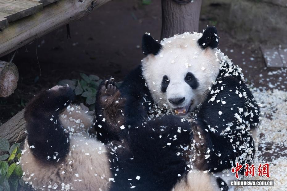 重庆:大熊猫“奇三妹”母女欢快玩木屑 变身“芝麻汤圆”