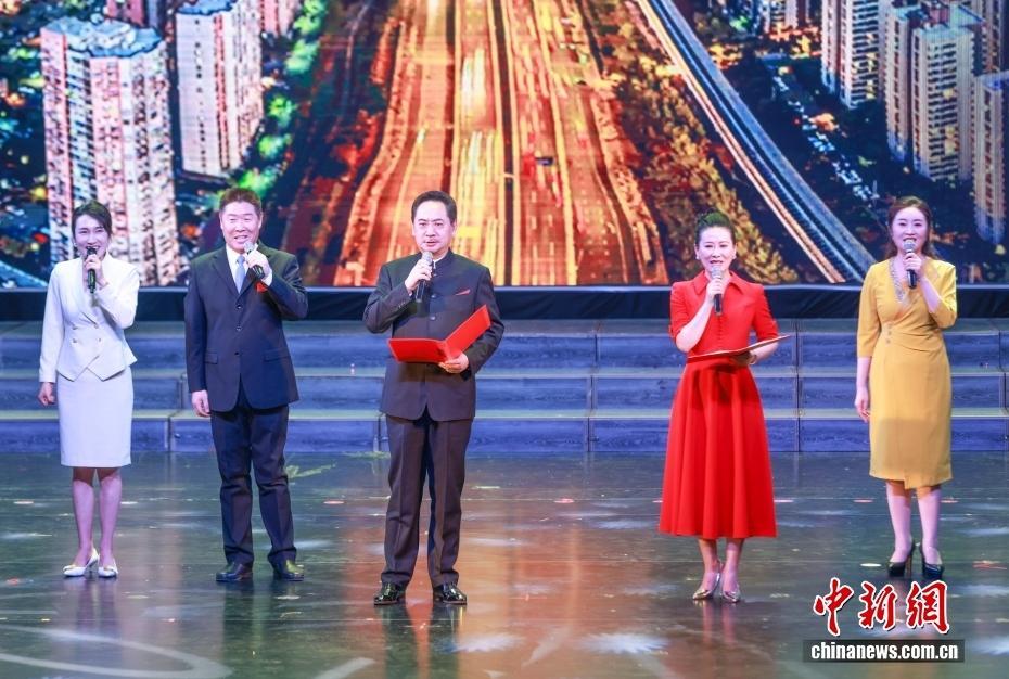 2月9日晚,“福满京城 艺润万家”北京市文联新春文化惠民演出暨“‘源’聚房山 骏驰福年”房山区2026年春节联欢晚会在北京市房山区文化活动中心梦想剧场举行。图为刘劲(中)、汪心怡(右二)表演朗诵《万马奔腾的中国》。中新社记者 贾天勇 摄