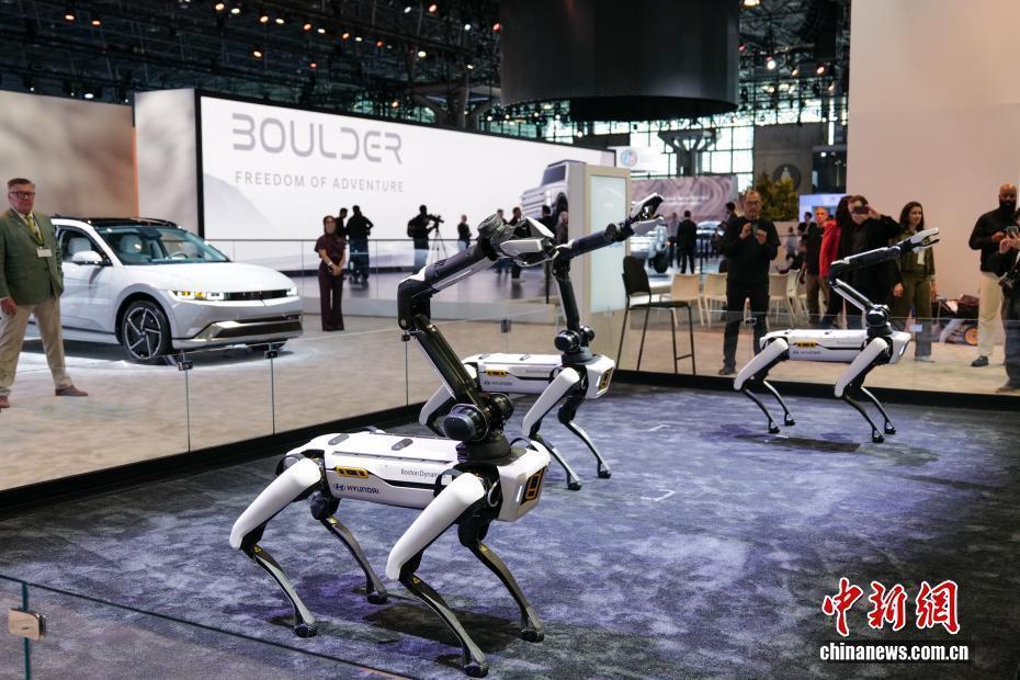 当地时间4月1日,2026年纽约国际车展在美国纽约贾维茨会展中心启幕,展出来自全球数十家车企的700多款车型。图为展会现场的机器狗表演。 中新社记者 王帆 摄