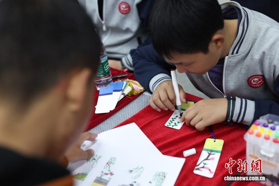 4月2日,孤独症儿童绘制书签。当日正值第19个“世界孤独症日”,北京地铁6号线朝阳门站内举办“流动的艺术馆——以画为媒,用爱点亮‘星’空”融合公益活动。现场展出来自北京市特殊教育资源中心的孤独症儿童的画作,并有多名孤独症儿童亲自来到现场手绘书签,体验地铁无障碍设施。 中新社记者 贾天勇 摄