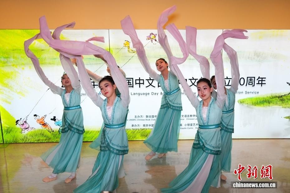 当地时间4月20日,2026联合国中文日暨中文处成立80周年庆祝活动在纽约联合国总部举行。各国代表、联合国职员等200余人欢聚一堂共庆中文日,观看展览和表演,体验中国文化。图为南京小银星艺术团表演舞蹈《踏春》。