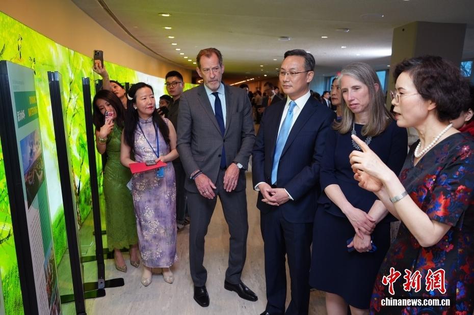 当地时间4月20日,2026联合国中文日暨中文处成立80周年庆祝活动在纽约联合国总部举行。各国代表、联合国职员等200余人欢聚一堂共庆中文日,观看展览和表演,体验中国文化。图为南京中国科举博物馆馆长冯家红(右一)向联合国助理秘书长沙莱(右二)、中国常驻联合国副代表孙磊(右三)等介绍“风雅秦淮 天下文枢”展览。